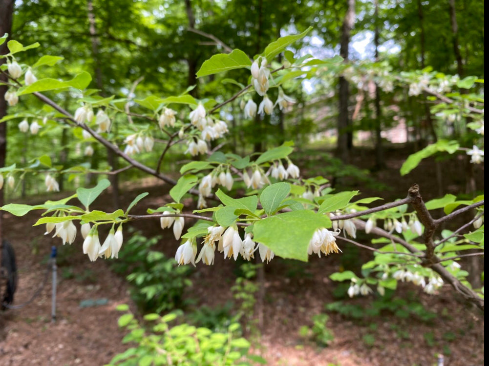 American snowbell is a multi-stemmed shrub for areas with wet soils and full sun to part shade. Native to wet woods, streambanks, and marshes in the Southeast, American snowbell dazzles in mid-spring with its profusion of dangling white flowers that resemble little bells. Hardy in zones 6-8. Matures to 6-10' tall and wide. Host plant to promethea moths.
