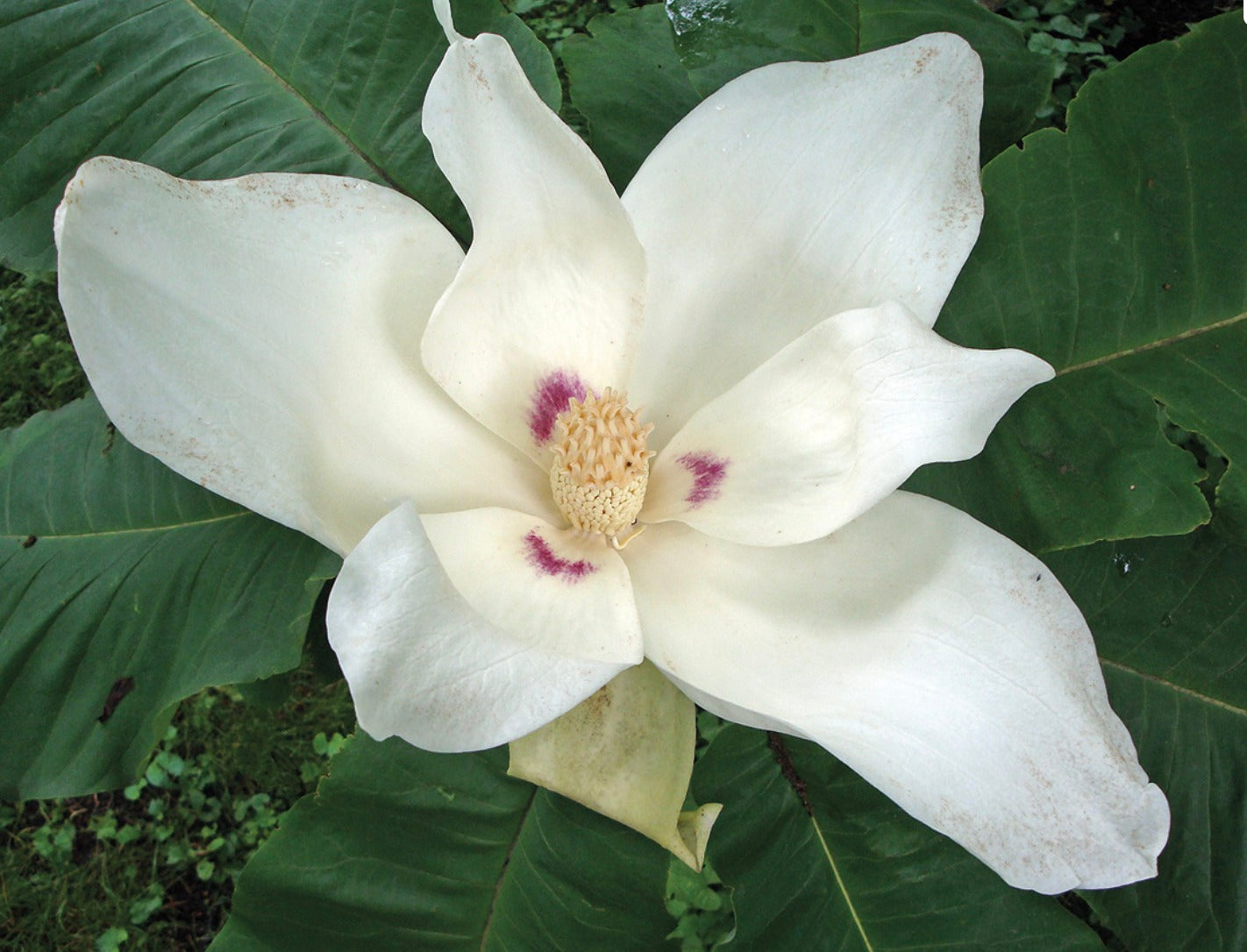 The bigleaf magnolia (Magnolia macrophylla) is a unique understory tree that is native to the southeastern United States. It is rarely found in the wild and has the largest simple leaves and flowers of any tree indigenous to North America. The leaves can measure up to 3 feet long and 1 foot wide while the showy fragrant flowers are 8 to 14 inches in diameter. The flower blooms in May-June and are cream-white with rose-purple at the petal base.